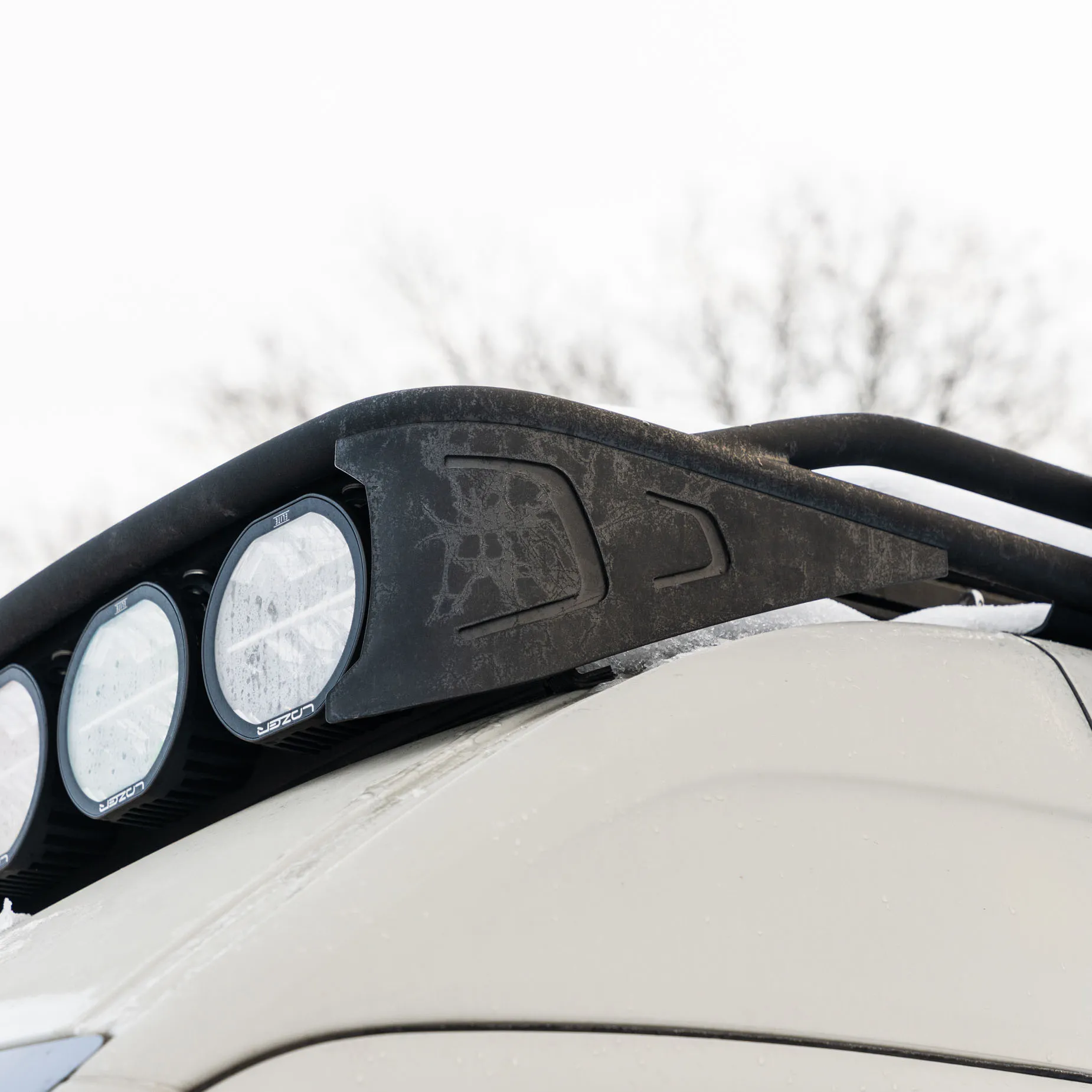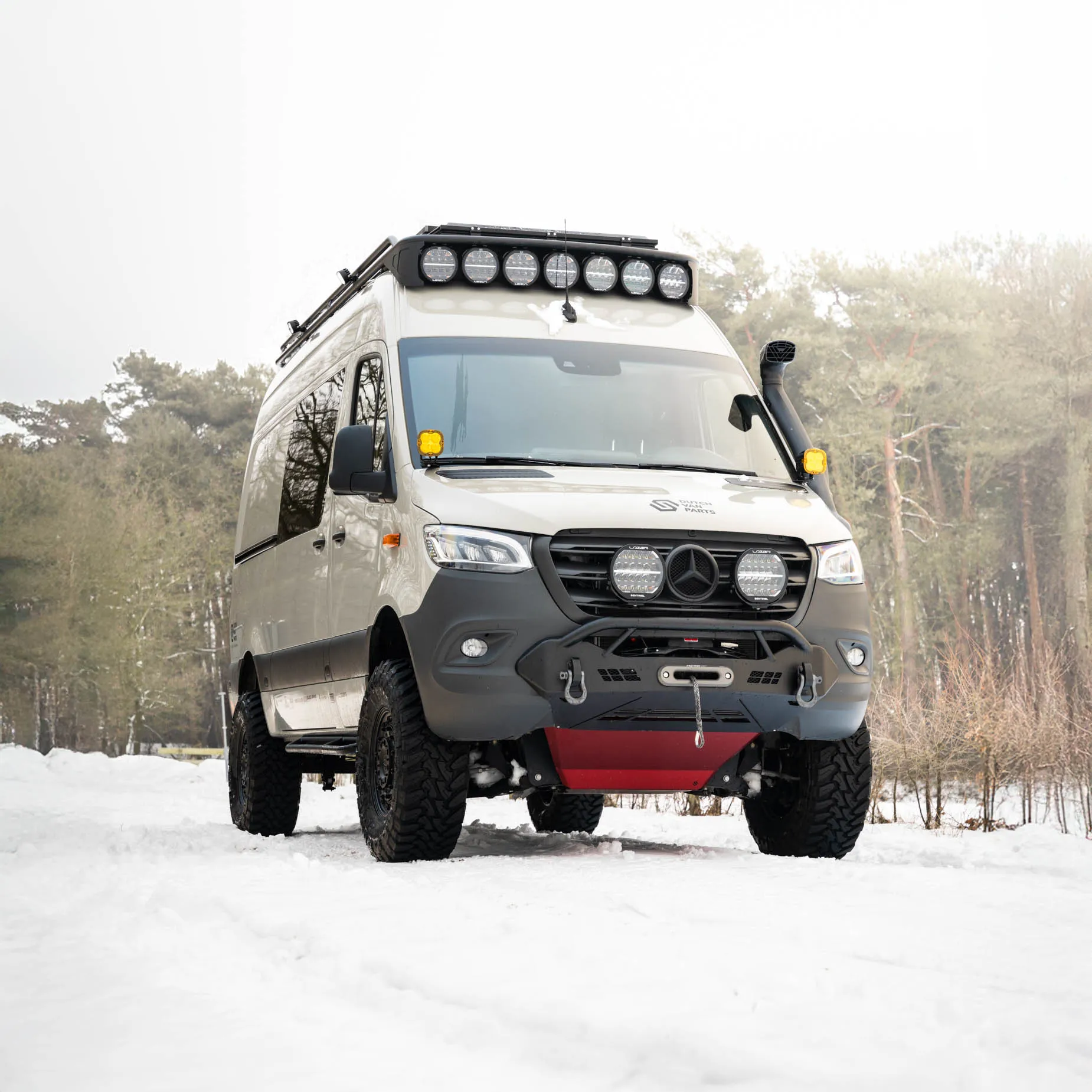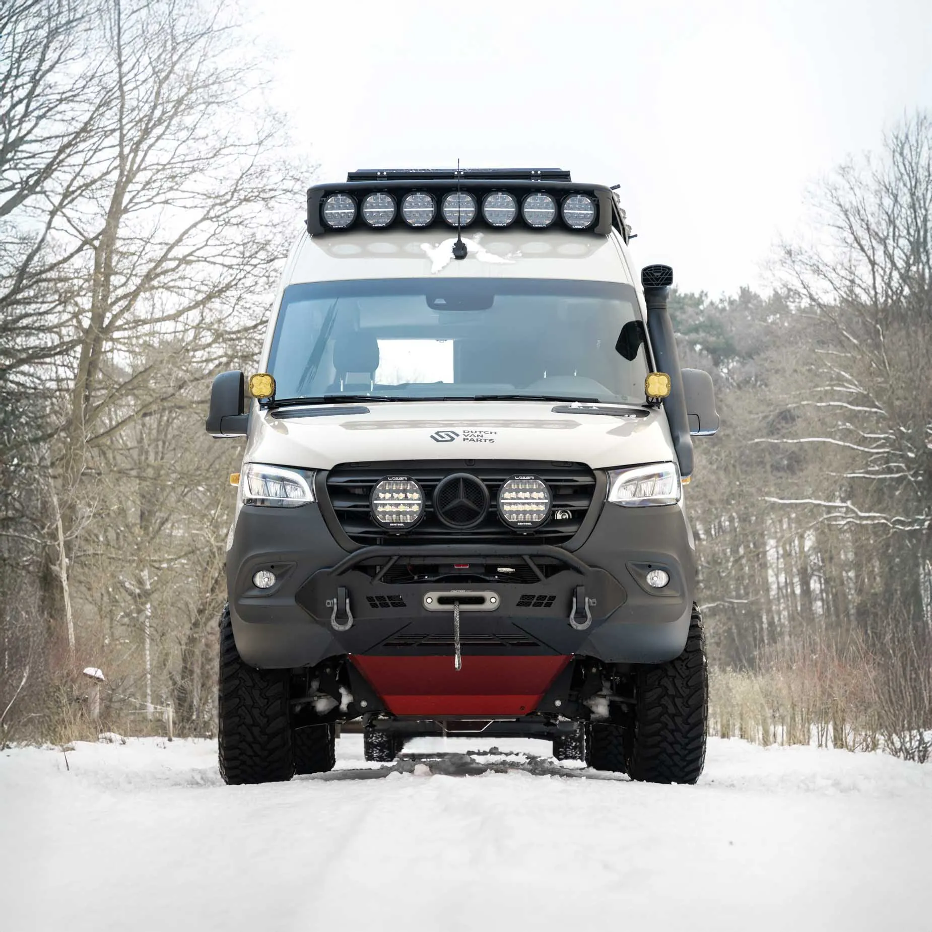 La galerie de toit Camp 3 s’aligne parfaitement avec les courbes de votre Mercedes Sprinter, combinant fonctionnalité et esthétique intégrée. La section avant est spécialement conçue pour accueillir 7 projecteurs Lazer Lamps Sentinel 7” Elite Black, offrant à la fois une allure impressionnante et des performances d’éclairage exceptionnelles.