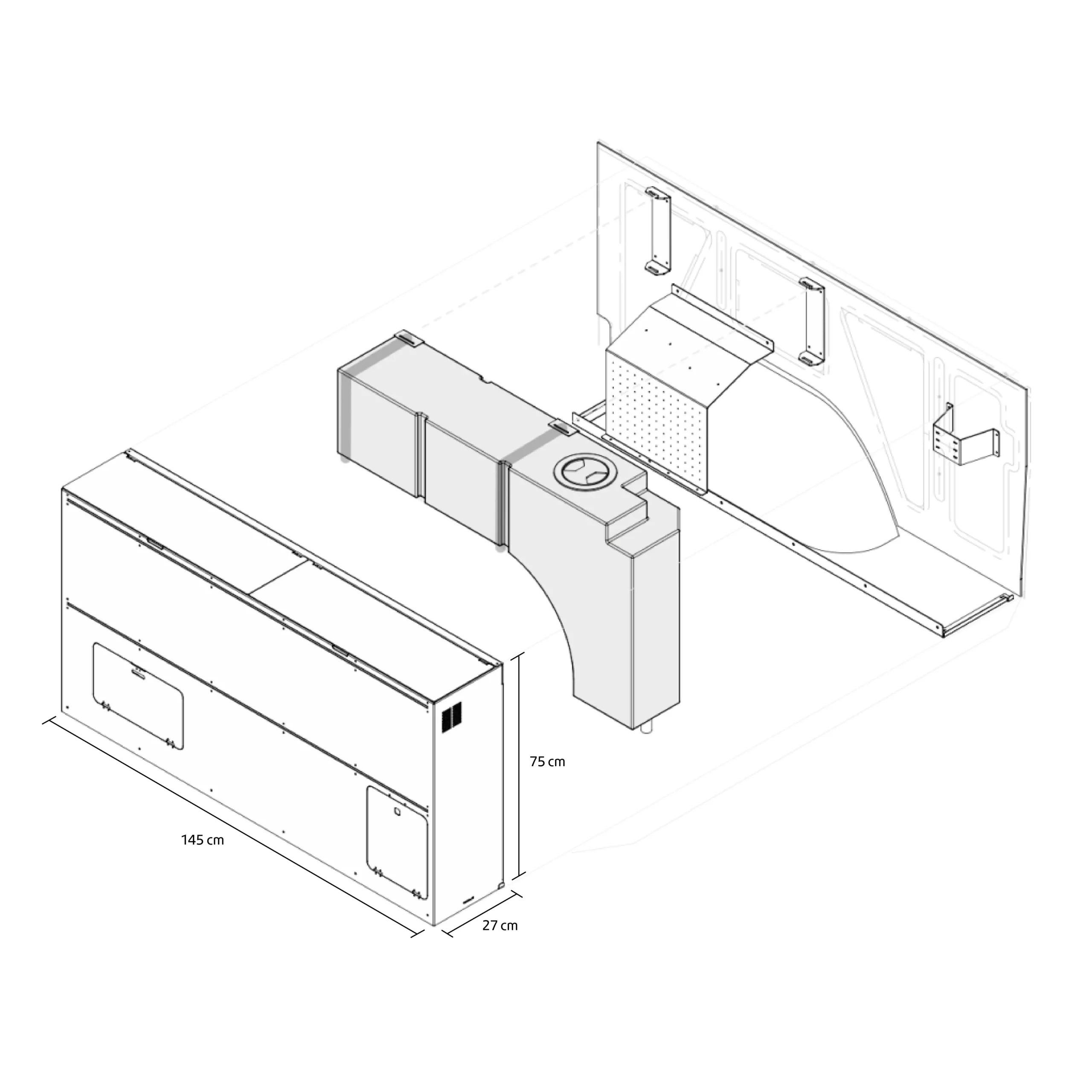 Le modèle côté passager est conçu pour intégrer un réservoir d’eau douce de 90 à 110 L et est fourni avec un support pour installer un système complet de pression d’eau. La version standard comporte un espace de stockage à l’arrière, mais il est possible d’opter pour un compartiment à gaz intégré. Des grilles de ventilation intégrées permettent l’évacuation de la chaleur et évitent la surchauffe des appareils.