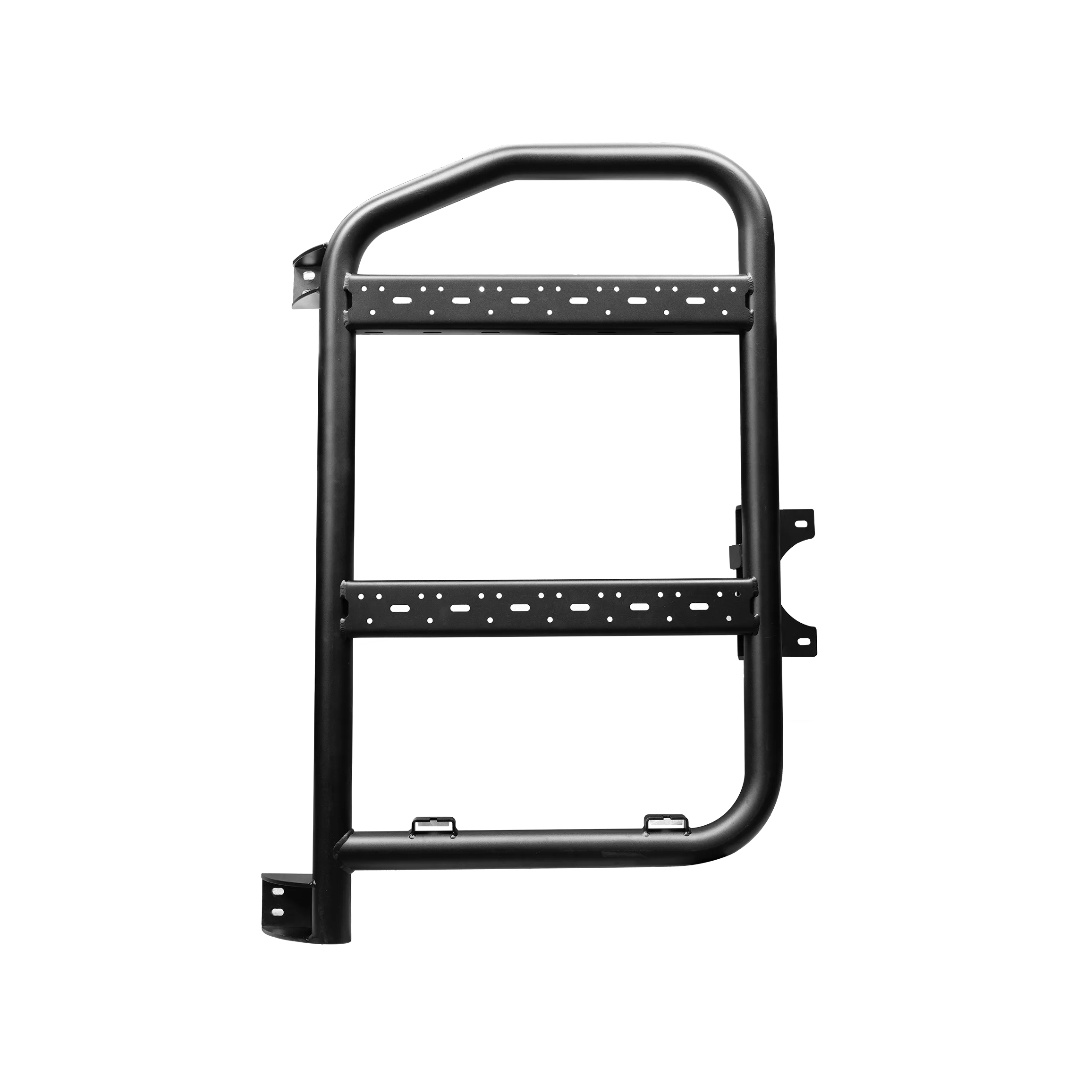 Portes 180° : L’échelle arrière se fixe sur les charnières et se monte sur la porte. Il faudra percer deux trous dans le châssis pour monter l’échelle sur les Mercedes Sprinter W907/W910/W906. L’échelle se connecte à la tôle derrière l’une de ses platines de fixation, assurant un design épuré.